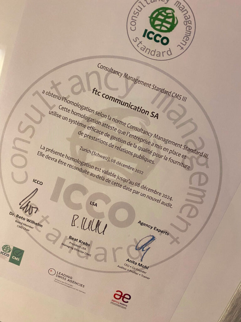 ICCO is the international umbrella organisation of national communications and PR consultancies. In Switzerland, Leading Swiss Agencies has been coordinating the certification of Swiss PR agencies according to this standard since 2020.